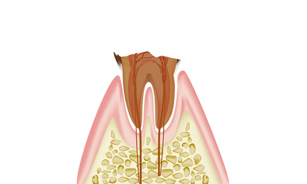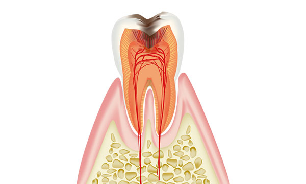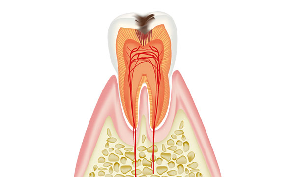 虫歯が象牙質の中でさらに進行し、歯の神経がある空間に達した状態です。 神経が細菌感染をおこし、激しい痛みがでます。激しい痛みによって頭痛を引き起こすこともあります。 主な症状は何もしていなくてもズキズキとした脈打つような激痛がでたり、温かいもので痛みが増し、冷やすと落ち着いたりします。 虫歯がここまで進行すると歯を残す為に神経を取る治療が必要です。