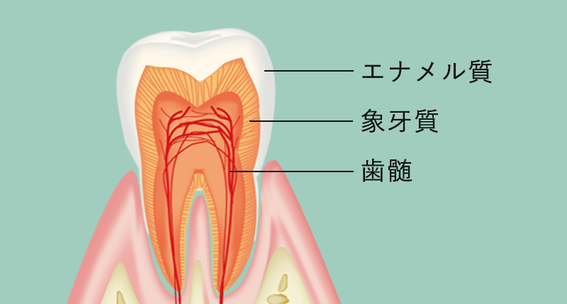 歯の組織は3層で構成されています。虫歯で痛みを感じるのは、歯の構造に関係しています。 歯の中心には神経があります。その神経を覆っているのが柔らかい組織の象牙質。象牙質の上には、エナメル層と呼ばれる固い層で覆われています。一番上の層のエナメル質は、身体の中で一番固い組織だと言われています。