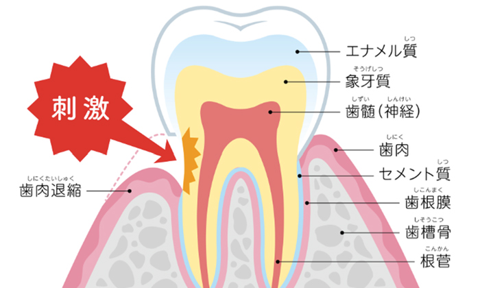 TVのCMではこれを知覚ホールと呼んでいますね。力が原因でエナメル質が欠けたり、歯茎が下がって歯の根が露出すると、刺激が伝わりやすくなるため、知覚過敏の症状がでやすくなります。