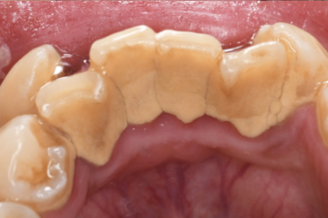 特に下の前歯の舌側(裏側)は、唾液の影響で歯石がつきやすいだけでなく、自分では見えにくい部位であるために歯ブラシが当てにくく、どんなにしっかり磨いていても数ヵ月ごとのクリーニングが必要なほど歯石がつきやすい部位といわれています。
