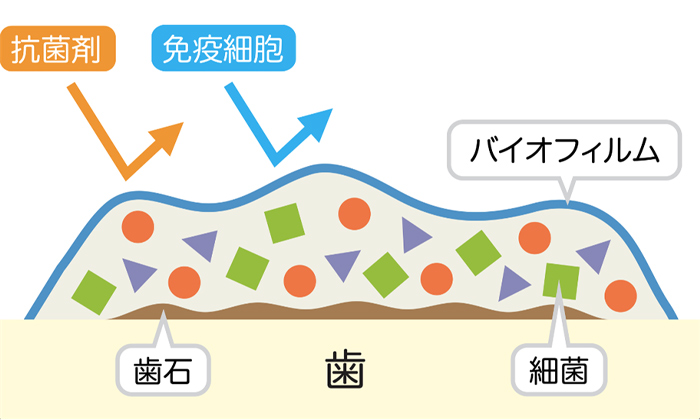 バイオフィルムは排水溝にできるヌメリのようなものです。バイオフィルムがあると、歯の表面の歯石や細菌を覆って保護してしまうため、フッ素や歯磨き粉・マウスウォッシュの抗菌成分が歯に浸透しにくくなってしまいます。